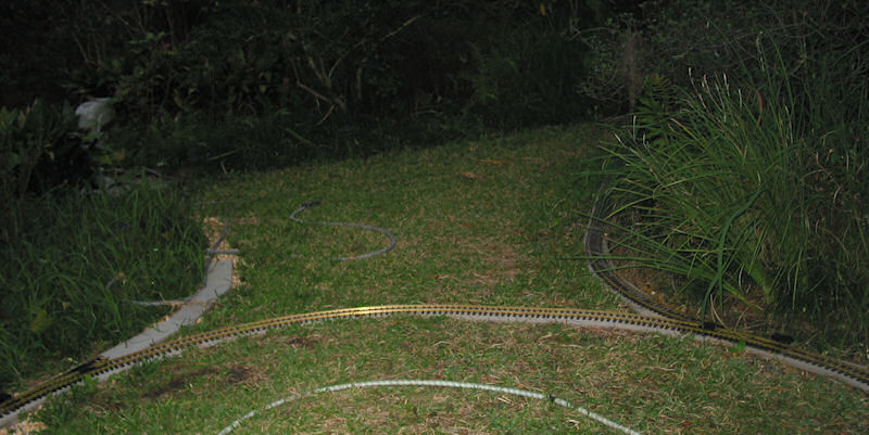 While finished too late for operational tests, the last 256 scale feet of track was laid this afternoon. The photo at left shows Harold making final adjustments to the trackage, while the linked image depicts the completed segment.