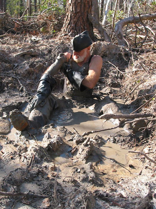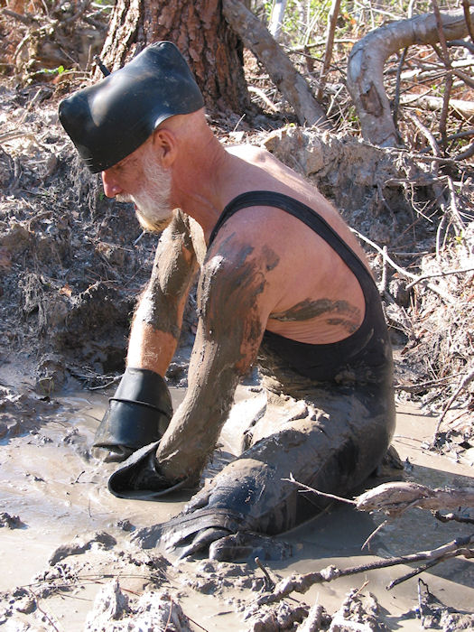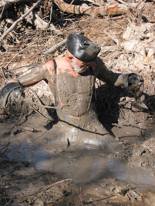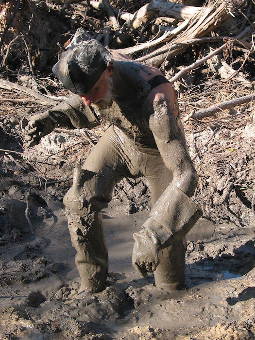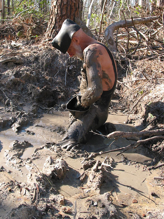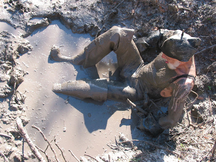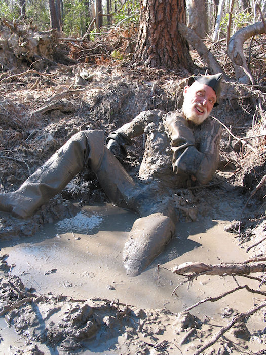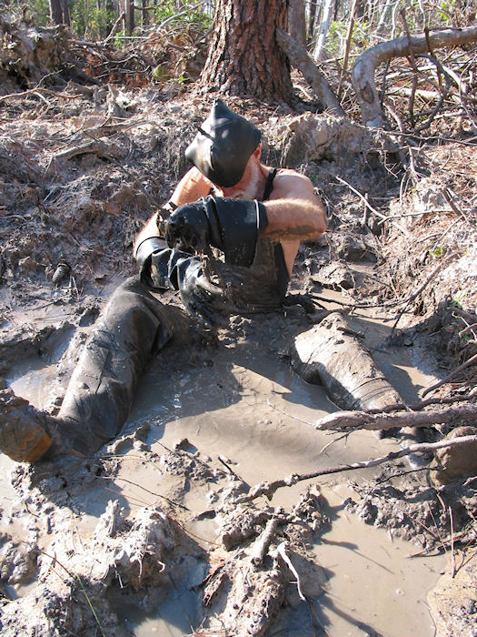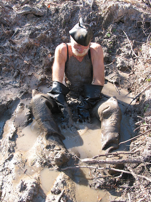 | Homo Sapiens was destined to walk erect. But, Homo Humus is another story! That mud load has to be conjured with! | Even my Coon Hunter boots don't guarantee traction in the deepening wallow! |