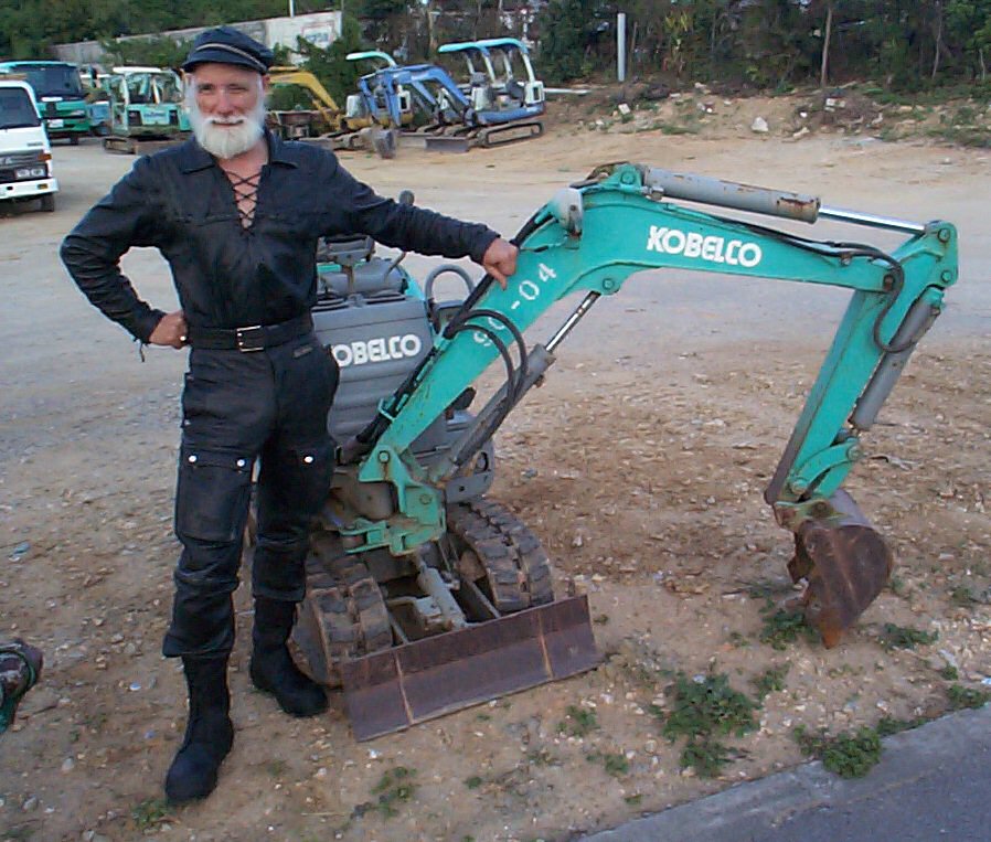 Many guys have visions of operating those huge backhoes and other construction toys. I've always found them rather intimidating. In Okinawa, I found a tool more my size! It just happened that I was wearing my thong front leather shirt, and the Hein Gerike "Paris to Dakar" Pants. Both names have been shortened for these very practical cargo pocket pants in leather: The company now just calls itself "Gerike", and the pants have been shortened to "Dakar". I believe the boots are actually insulated rubber, from France.