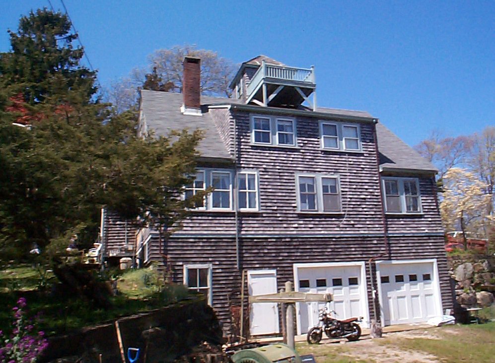 A Widow's Walk, for those who may not know the term, was a lookout deck on the top floor of many coastal homes, especially in fishing communities. The wife would mount the stairs to try to catch a first glimpse of her husband's returning ship. Because you used to have to crawl through a hole in the attic to get to it, the owner had it relocated to an area just above the second floor, where it is in the linked photo. On this greatly sloped lot, the garage is at the basement level! |